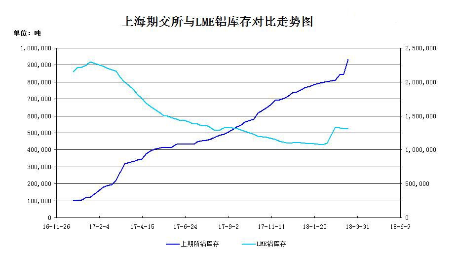 宏观方面:中美贸易战的阴云正在逐渐笼罩。美国国际贸易委员会表示,其调查发现,自中国进口的铝箔正在伤害美国生产商。这意味着美国将对中国的铝箔出口商征收最高188%的关税。中国也采取反制措施,有机构指出中国正在逐渐减持美债,中国的美债持仓已经创六个月来的新低,这势必会抬升美债借贷成本,对美股造成打击。因此美国国内对特朗普的政策有一定怀疑态度。伴随着“通俄门”的进展,特朗普被弹劾的风险又再上升,这也波及到了美股,美元也重新走强,外盘铝价一路下挫,并最终失守2100美元关口。