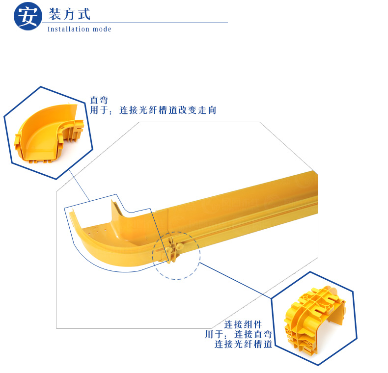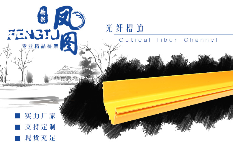 根据高标准机房建设要求,吸收国外产品的优点结合中国国情而开发的新产品,槽体及出纤口等其它配件采用优质阻燃材料,整体性好,安装简单,转角处有圆角保护,确保光纤过弯半径大于40mm;出纤口为阻燃塑料加工而成,带圆角保护,可在槽体任意移动,方便光纤在合适位置下纤。