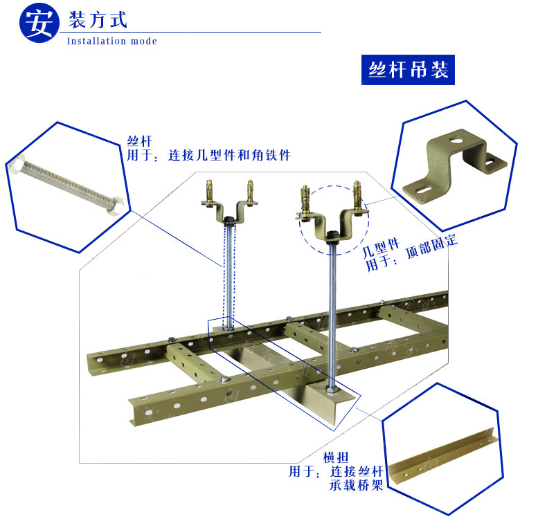 ●吊杆:可选用(1)Φ8-16mm的丝杆;(2U型主梁