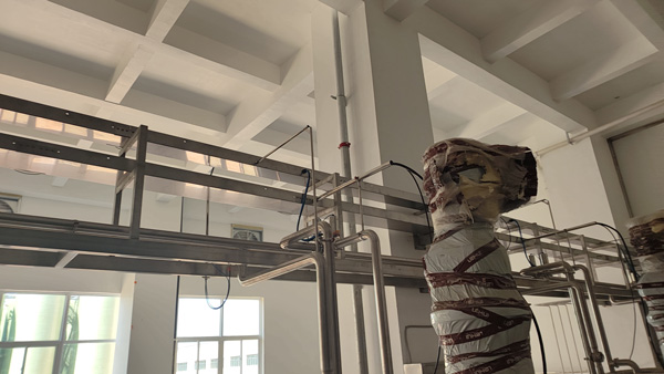 该厂房主要以钢混和不锈钢钢架结构为主,主干线路桥架水平安装在不锈钢钢架上,每2米之间使用不锈钢支架固定,水平安装桥架时离地间隙超过2.5米,避免影响通道,支线段桥架敷设采用垂直悬空安装。