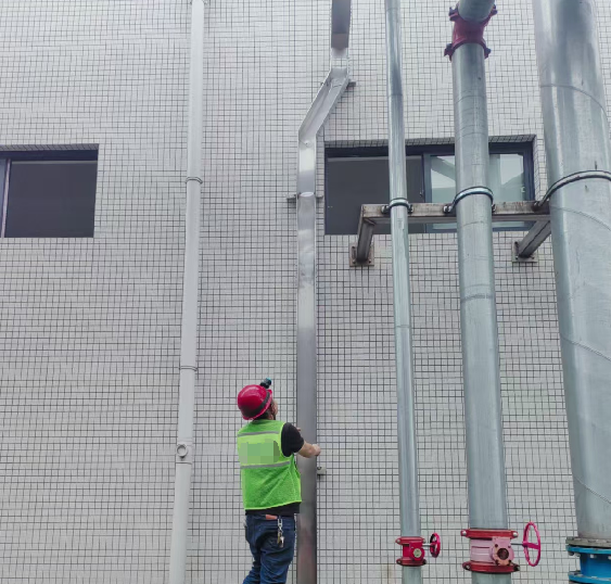 不锈钢桥架安装位于厂区管廊上时,离地间距超过3m,使用桥架托臂焊接到水管上。